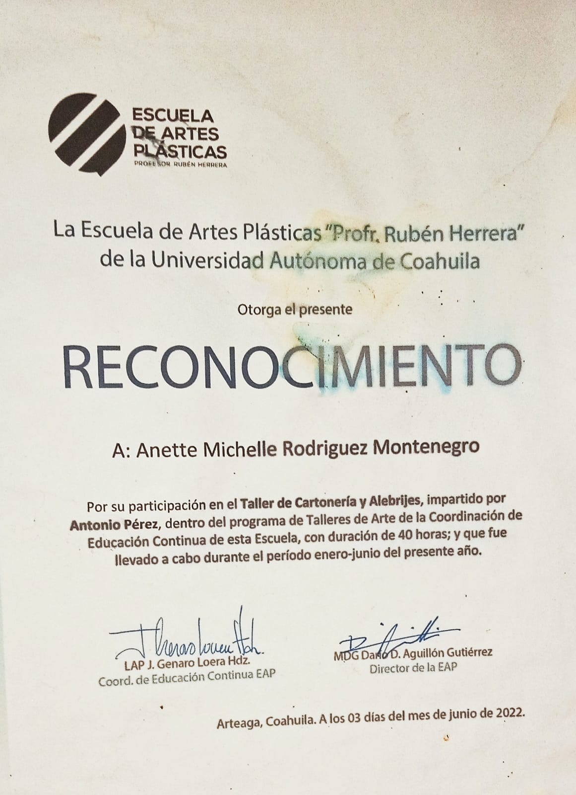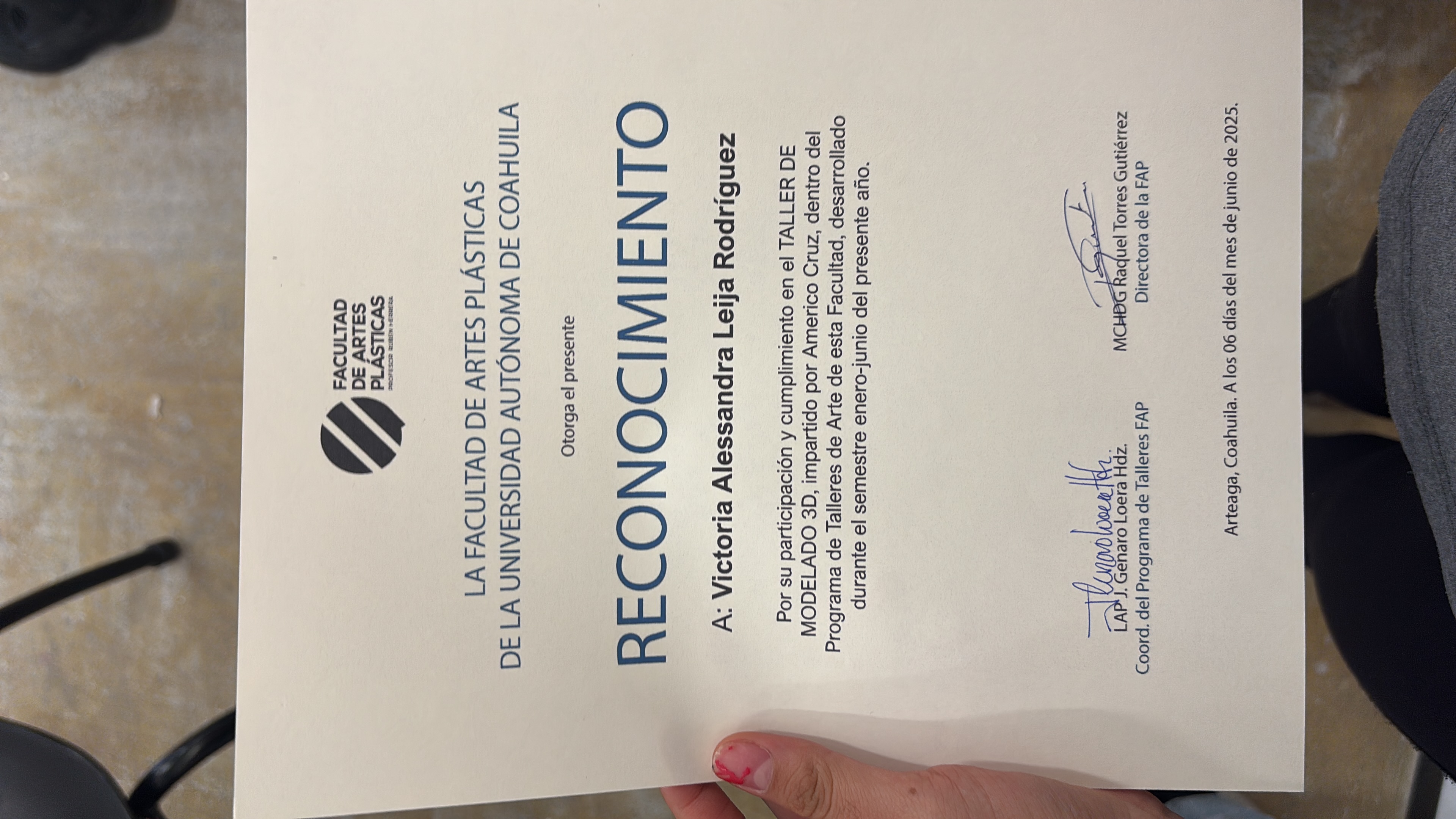 | 23219461 | LAP | Quinto | Agosto-Diciembre 2023 | Exposición Individual: Memorias Laguneras en la Galería de la Facultad de Artes Plásticas | 2024-04-23 | 1 | Descargar | Exposición Individual realizada en la Facultad de Artes Plásticas. | GALVÁN RODRÍGUEZ DIEGO SEBASTIÁN |