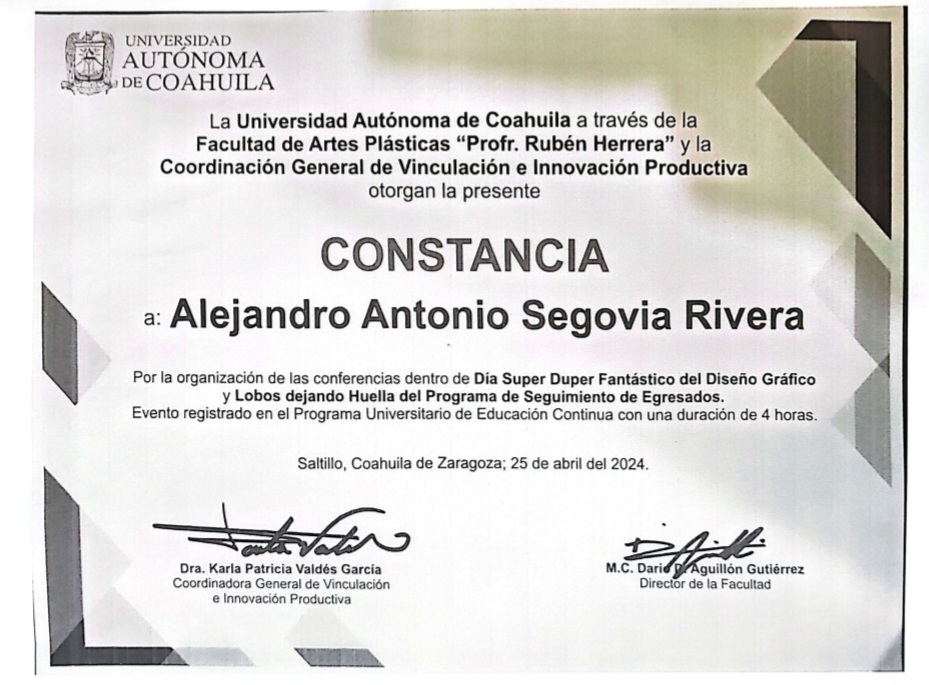 | 21289959 | LDG | Octavo | Enero-Junio 2022 | Jurado en Festival Arte y Cultura CECyTE-EMSaD Coahuila 2024 | 2024-09-05 | 20 | Descargar | | Segovia Rivera Alejandro Antonio |