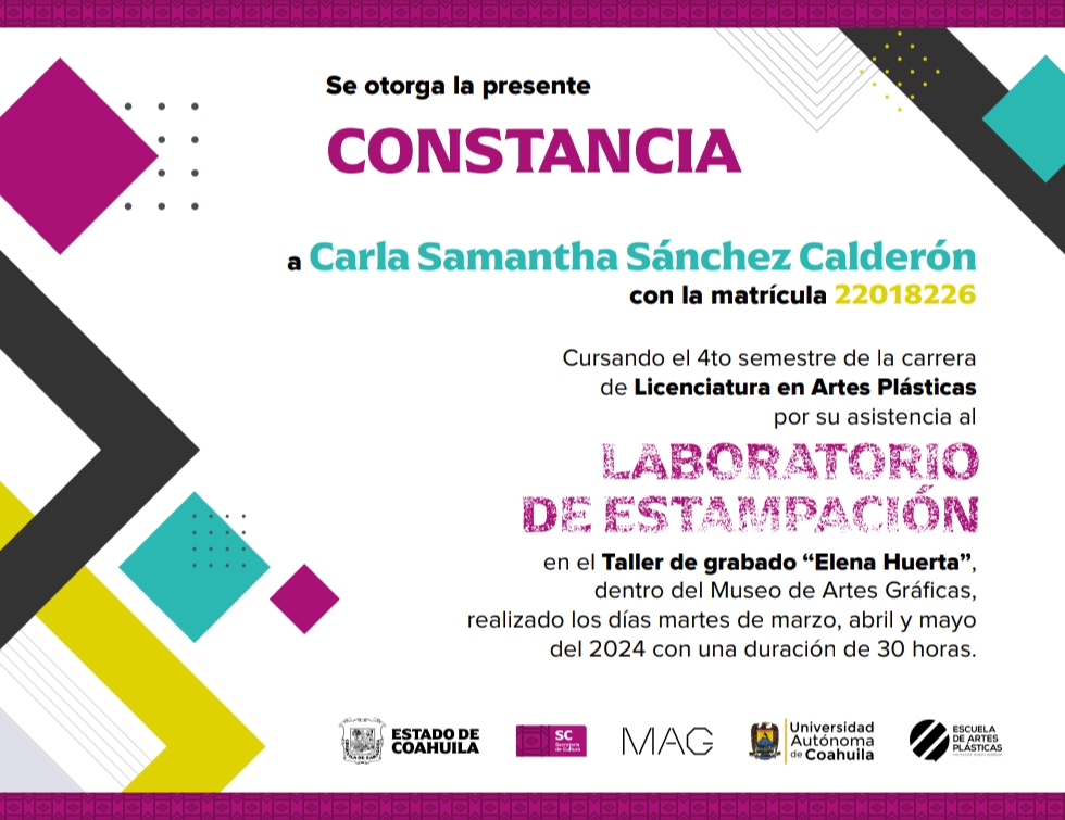 | 22018226 | LAP | Séptimo | Agosto-Diciembre 2022 | Laboratorio de estampación | 2024-03-05 | 30 | Descargar | Estuve en el taller de laboratorio de estampación en el taller "Helena Huerta" impartido por la profesora Judith | Sanchez Calderón Carla Samantha |