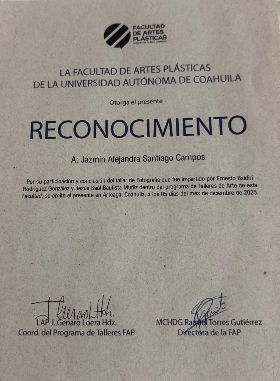 | 25207537 | LDG | Primer | Agosto-Diciembre 2025 | Taller Fotografía | 2025-08-16 | 20 | Descargar | | Santiago Campos Jazmín Alejandra |