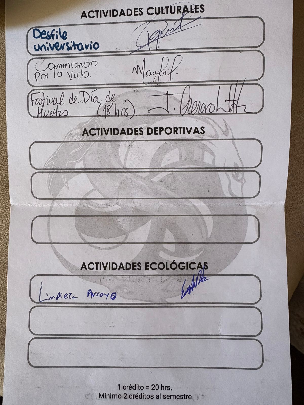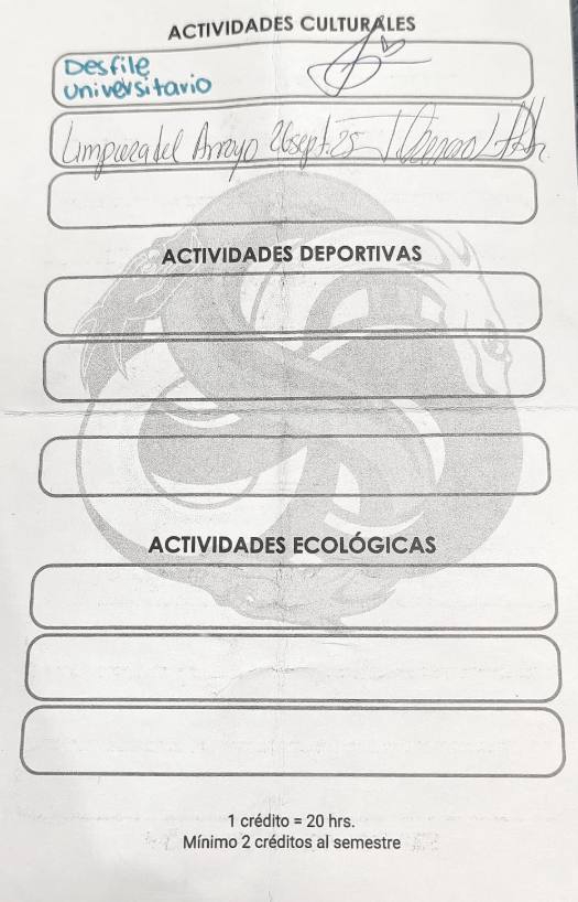 | 23054361 | LDG | Cuarto | Agosto-Diciembre 2025 | Limpieza del arroyo | 2025-09-26 | 5 | Descargar | No tengo comprobante, pero se hizo un registro en forms y posteriormente firmamos unas hojas donde ya estaba registrada. Solo que no tengo foto de eso. | Rivas Ponce Camila |