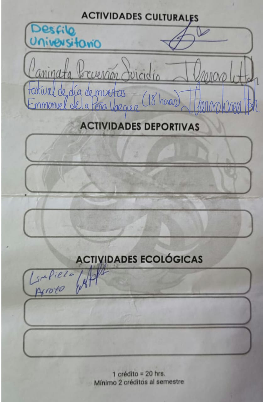 | 25072387 | LDG | Segundo | Agosto-Diciembre 2025 | Dia de muertos | 2025-10-31 | 15 | Descargar | 5 sesiones ayudando a los preparations. | Hernandez Rogelio Estrella Yoselin |