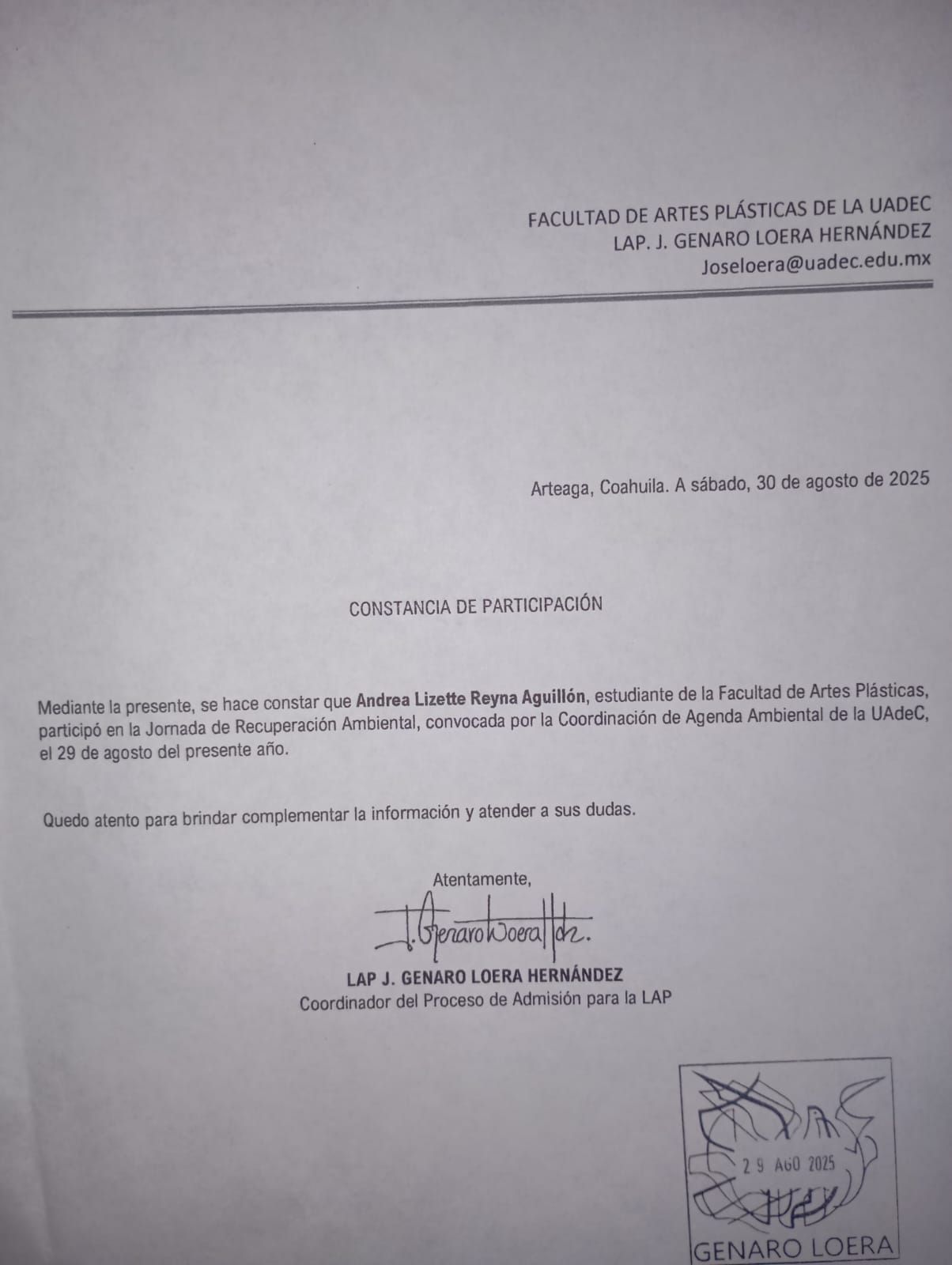 | 25075665 | LAP | Primer | Agosto-Diciembre 2025 | Jornada de Recuperación Ambiental | 2025-08-29 | 10 | Descargar | | Reyna Aguillón Andrea Lizette |
