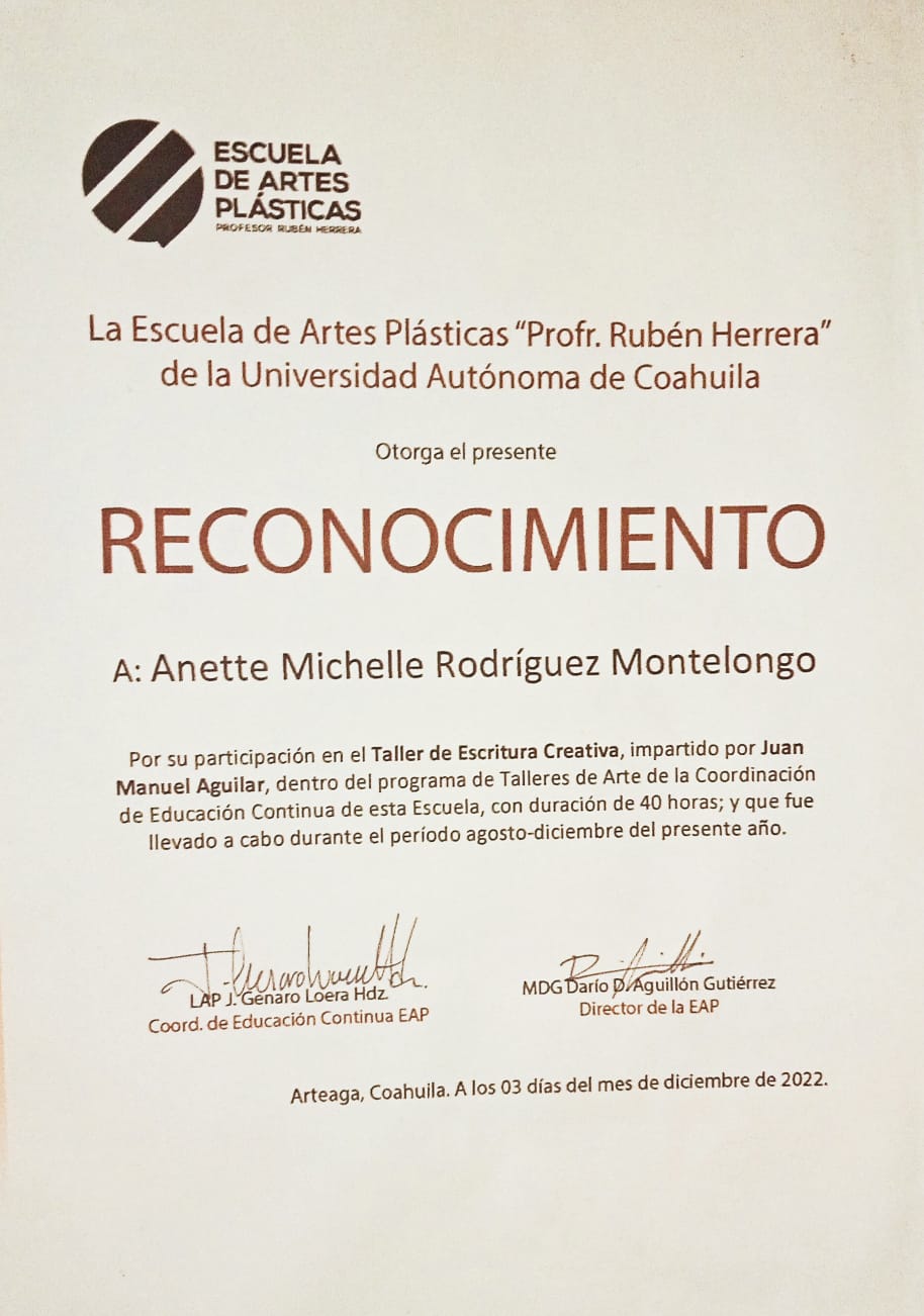 | 18016421 | LAP | Octavo | Enero-Junio 2022 | Taller de Escritura Creativa | 2022-08-26 | 40 | Descargar | | RODRIGUEZ MONTENEGRO ANETTE MICHELLE |